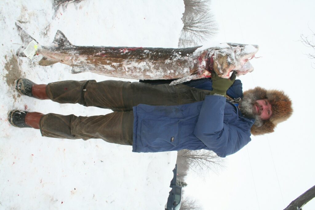 8:35 a.m.: John Jenkins, Bill’s son and veteran spearer, just showed up. He has many sturgeons under his belt. He wants this reporter to get one too. I don’t know why but year after year after year after year after year John wears the same look of pity around me. He gives me his secret weapon decoy. It’s a…and please keep this quiet so everyone’s not utilizing it….a plastic pail. I thank John profusely as the pail is lowered to hang next to the white pipe. John tells me that Paul Wargowsky is on his first sturgeon hunt, his shack just 100 yards from mine. Old Paul (who’s actually is only about 30) flipped back the lid this morning and there was a 58-inch sturgeon. Just three minutes into his first season, and his tag is filled. I tell John to congratulate good old Paul Wargowski of Whitewater for me. Although I don’t know him.